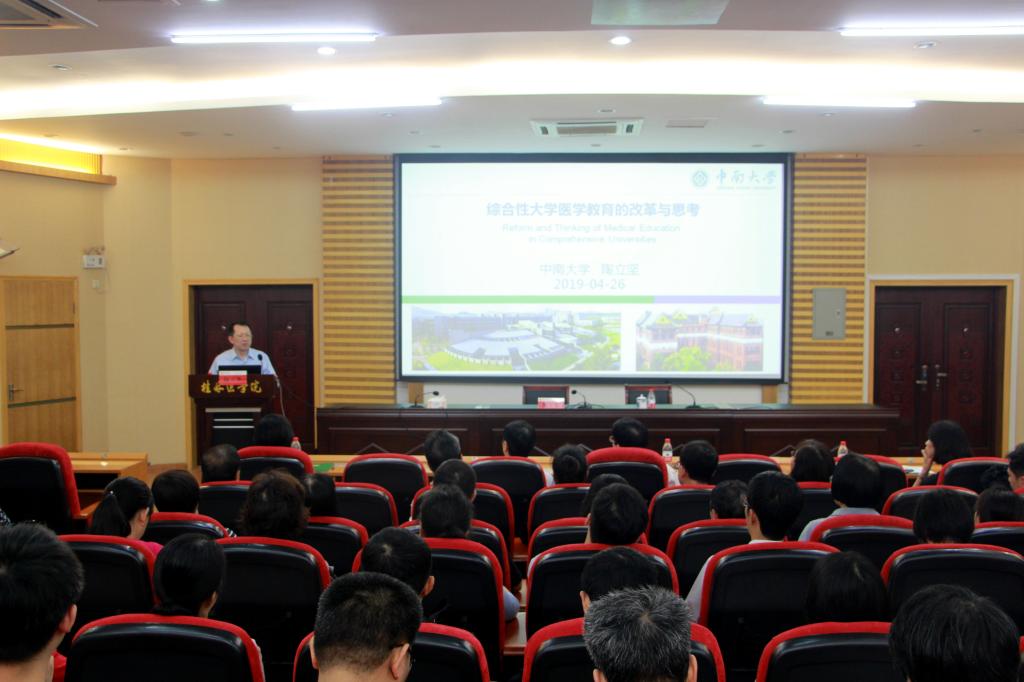 为贯彻落实全国全区教育大会精神,全面推进“以本为本”、“四个回归”,促进beat365官网教师更新教育教学观念,拓宽教育教学视野及改革思路,稳步推进学校高水平本科教育工作,4月26日上午学校在东城校区举办了“特色一流本科”大家讲坛系列活动。本次活动特邀请中南大学党委常务副书记陶立坚教授作题为“综合性大学医学教育的改革与思考”的报告。校领导黄照权、张志勇、孙莉、陈旭,学校教学委员会成员、校级教学督导专家、教师教学发展中心、教务处、学工处、团委、各教学单位相关领导和管理人员及一线教师等到场聆听。校党委书记黄照权教授主持报告会,并致欢迎辞,对陶立坚的到来表示热烈欢迎。