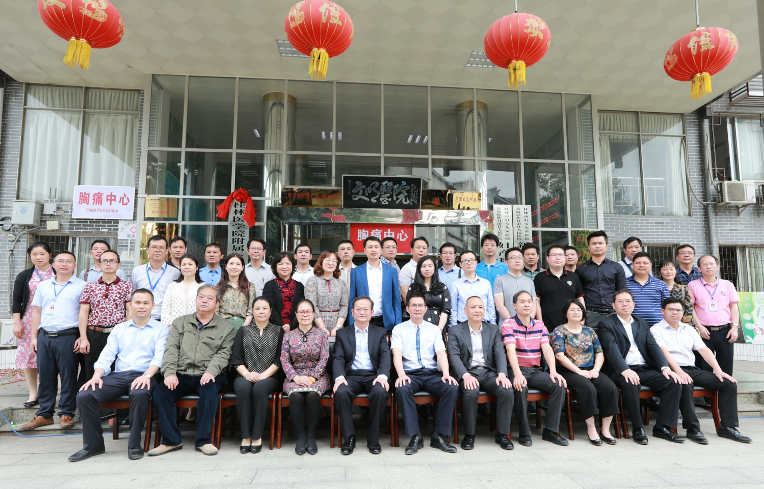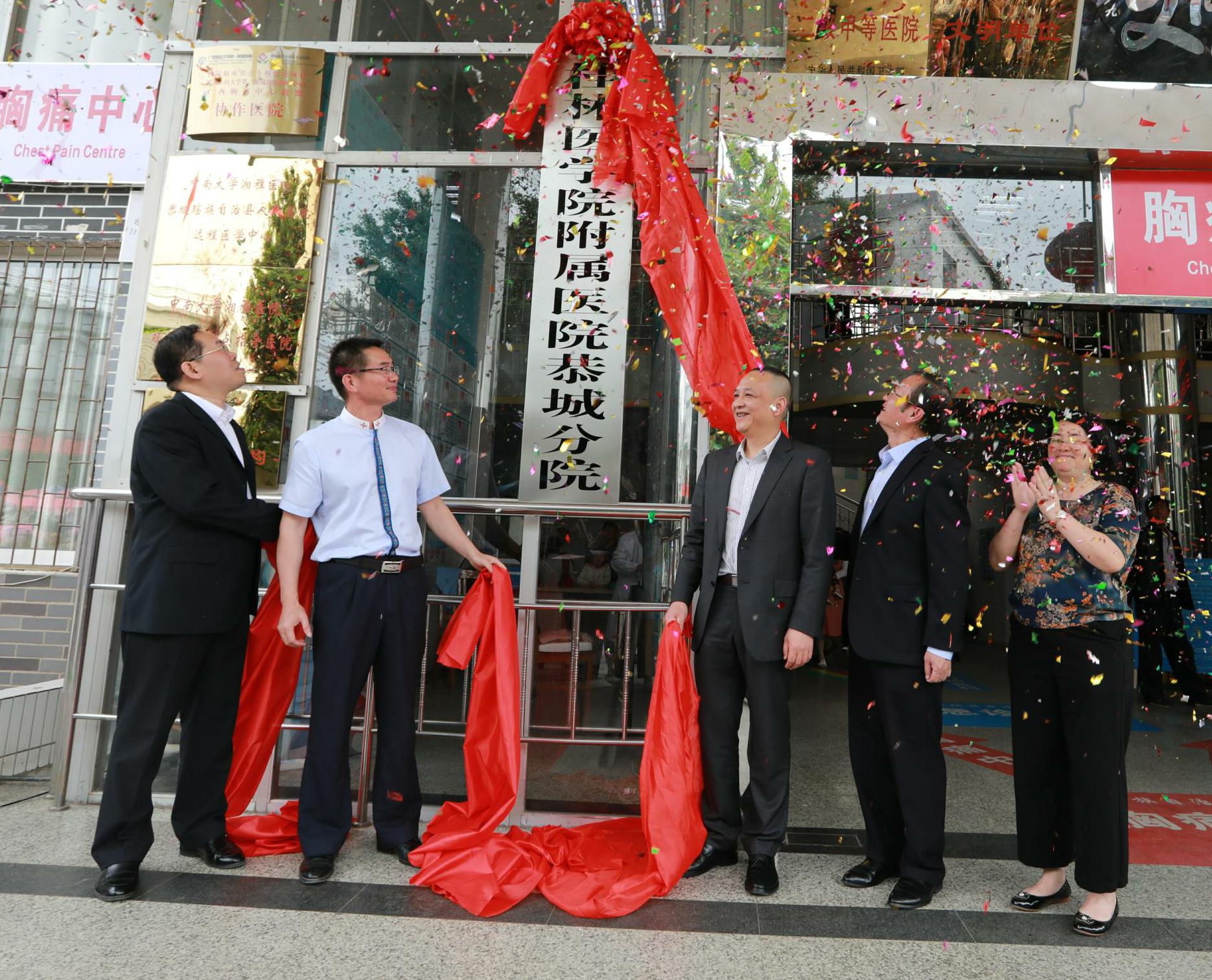 桂林市卫健委副主任卢浩华,附属医院副院长曾锦荣,附属医院副院长、恭城县人民医院院长蒋伟,恭城县委常委、县委办主任周俊缤,县委常委、挂职副县长秦耀武,县人大常委会副主任吴艳琴,副县长蒋舒羽,县政协副主席陈念翠,县卫健局相关领导、县医疗集团各成员单位主要领导,县人民医院领导班子、职能和临床医技科室主任及护士长等出席揭牌仪式。揭牌仪式由恭城县卫健局局长宾建才主持。