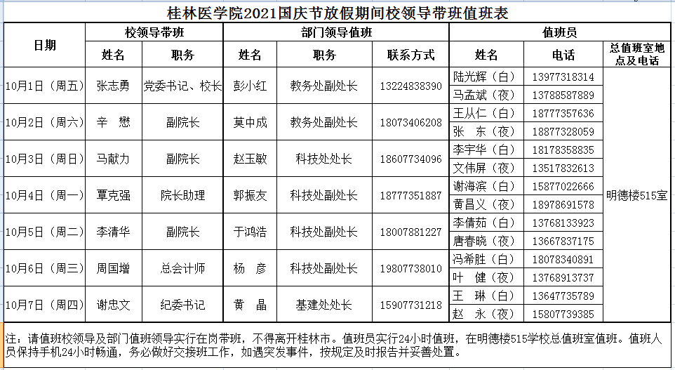 (三)值班地点:学校总值班室(临桂校区明德楼515室)。