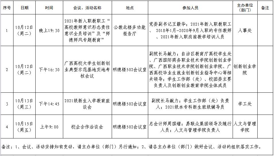 2021-2022学年上学期第七周学校会议、活动安排表(2021年10月11日-2021年10月17日)