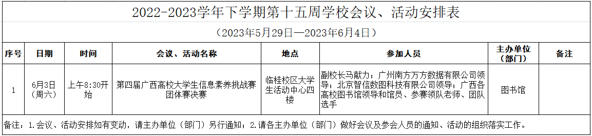 2022-2023学年下学期第十五周学校会议、活动安排表(2023年5月29日—2023年6月4日)