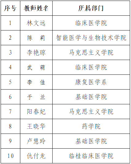 按照《关于印发<beat365唯一官网本科课堂教学质量奖评选办法>的通知》(桂医教评〔2022〕5号)文件要求和“2022-2023学年第一次本科课堂教学工作会议暨教学督导会议”精神,学校开展了2022-2023学年beat365唯一官网本科课堂教学质量奖的评选工作,由二级学院(系、部)初评,学校组织专家和学生进行现场授课评价,经学校教学委员会审核,临床医学院林文远等10名教师拟入选“beat365唯一官网2022-2023学年本科课堂教学质量奖”。现予以公示(具体名单见附件)。