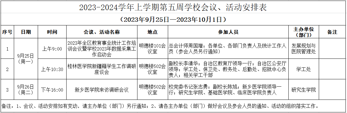 2023-2024学年上学期第五周学校会议、活动安排表(2023年9月25日—2023年10月1日)