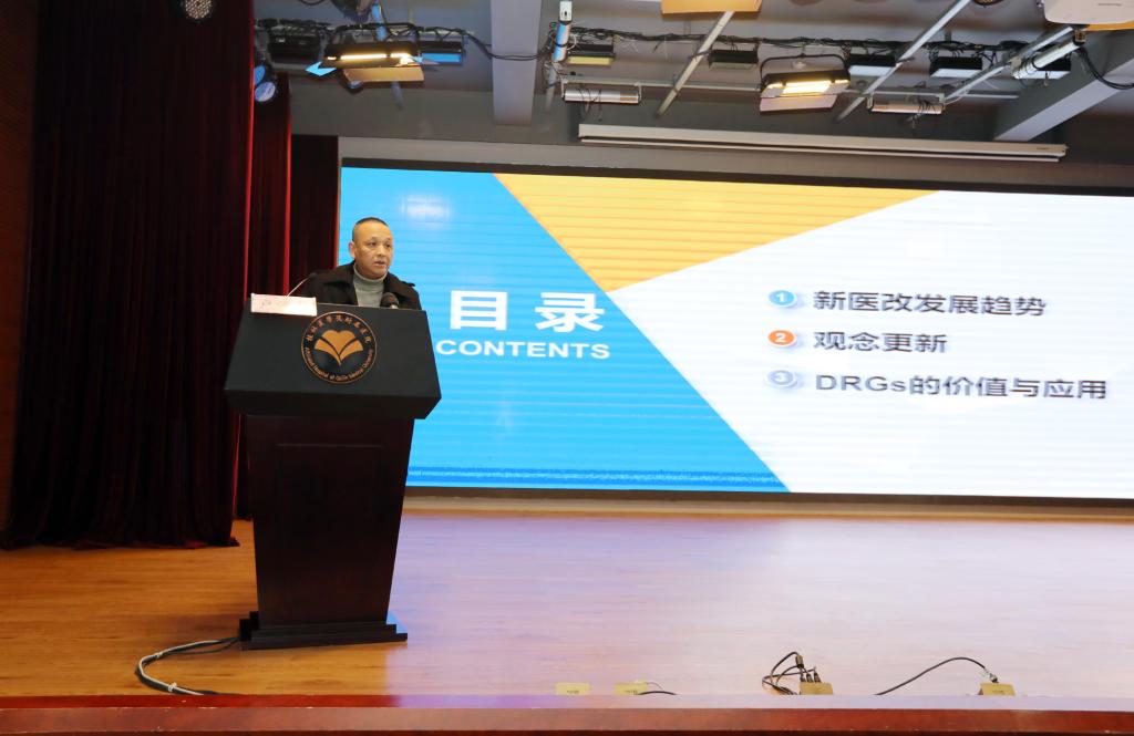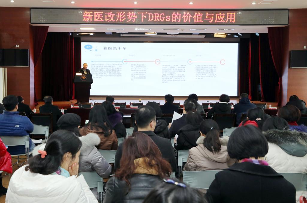 1月21日下午,桂林市卫计委副主任、市医改办副主任卢浩华应邀来到附属医院作“新医改形势下DRGs的价值与应用”专题讲座。医院全体领导、各临床科室主任、护士长、总住院医师及医技科室、职能科室负责人到场聆听了讲座。医院副院长曾锦荣主持讲座。