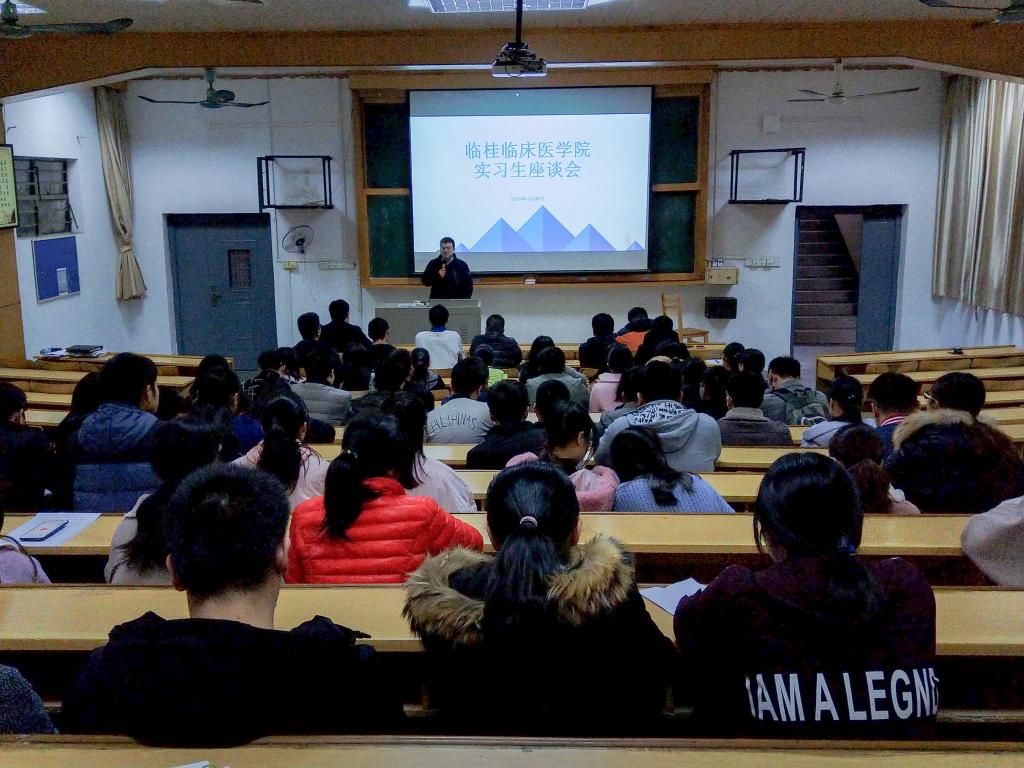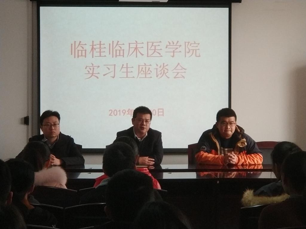 2019年1月30日下午,beat365唯一官网临桂临床医学院于二附院8号楼6楼会议室及乐群校区T1教室分别举行了实习生座谈会,团委书记、学工办主任潘涛主持会议,二附院(临桂临床医学院)党委副书记刘梦青、辅导员陈辰出席会议。