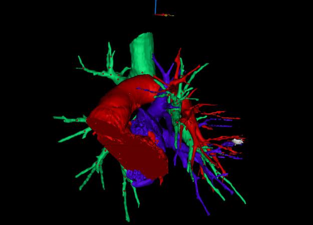 模型真实地还原了患者的动静脉和支气管,既可以旋转观察,还可以做成三维动画,拷入iPad中带到手术室,在手术中可以通过iPad查看。