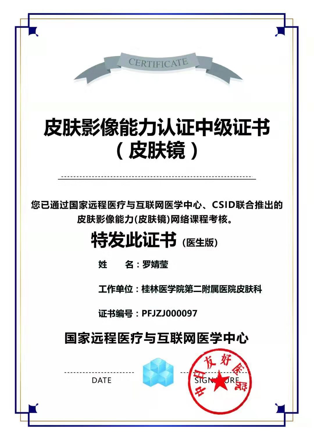 2019年2月23日下午,“2019年广西皮肤性病学新进展新技术国家级继续教育学习班暨广西皮肤性病科专科联盟发展论坛”在广西南宁举行。大会期间,国家远程医疗与互联网医学中心组织了皮肤影像能力认证皮肤镜中级考核,beat365唯一官网第二附属医院皮肤科副主任罗婧莹顺利通过考核,获得皮肤镜中级证书。