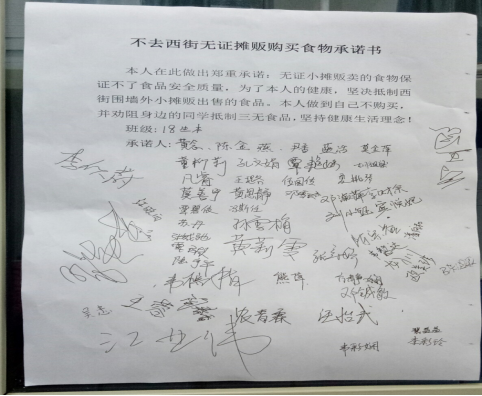 为加强宣传教育,提高学生风险意识,增强防范效果。生物技术学院专程制作和张贴了食品卫生安全宣传海报,印制了300多份食品卫生安全宣传单在西街校道发放;同时组织全院学生签署《不去西街无证摊购买食品承诺书》,对西街外墙无证流动商贩经营行为说“不”。食品卫生安全事关师生切身利益,事关校园稳定,让我们共同关心食品卫生安全,营造安全和谐的校园环境。