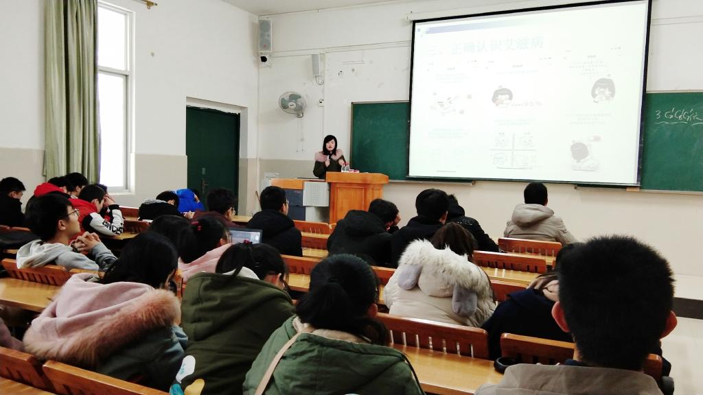 黄晨老师就艾滋病当前发展形势、传播途径、以及结合检验专业性质的角度向同学们讲授了如何预防艾滋病等方面的知识,同时她强调艾滋病是可防可控的,不要谈"艾"色变,要用正确的认识方式对待艾滋病,关爱艾滋病人,将健康保卫战进行到底。