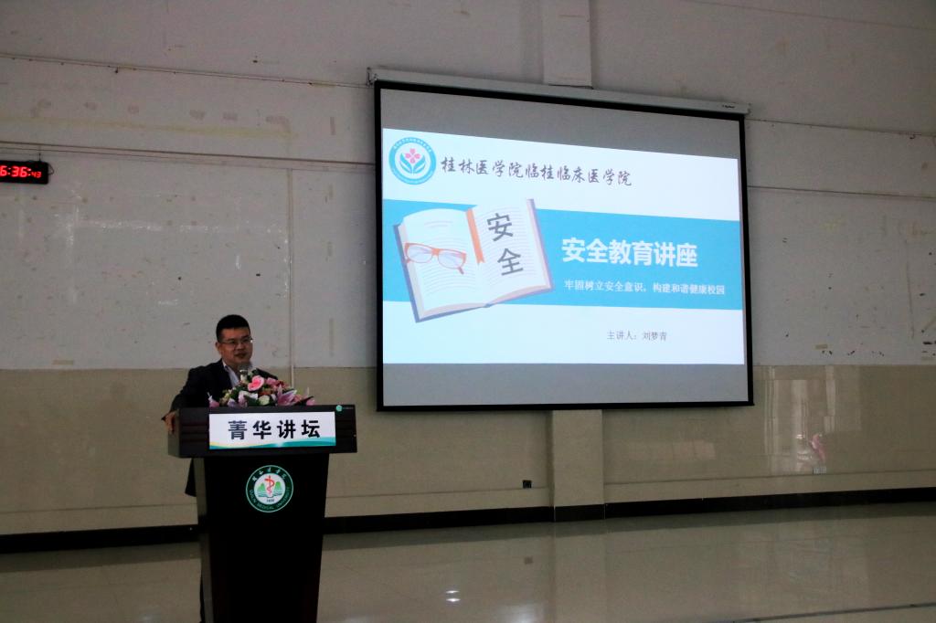 为深入贯彻落实学校安全隐患大检查大整治活动实施方案精神,扎实做好学生安全稳定工作,加强对学生的安全教育。2019年3月13日,临桂临床医学院“菁华讲坛”第一讲之安全教育讲座在临桂校区教学南楼多功能报告厅召开。本次讲座由beat365唯一官网第二附属医院(临桂临床医学院)党委副书记刘梦青主讲,学院学工办全体辅导员、全体兼职班主任以及临桂校区班级学生共360人参加了讲座。