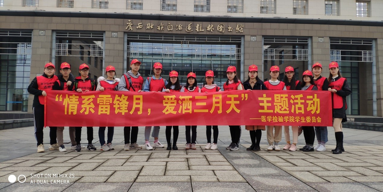 为弘扬雷锋精神,提高大学生道德品质,医学检验学院于3月16日、17日开展了“情系雷锋情,爱洒三月天”学雷锋系列志愿服务活动,本次活动由我院学生会承办。院志愿者在学生会各领队的带领下分别前往 “桂林图书馆”、“桂林博物馆”、“临桂献血屋”、“正阳献血屋”、“中心广场献血屋”、“临桂福利院”进行志愿服务。