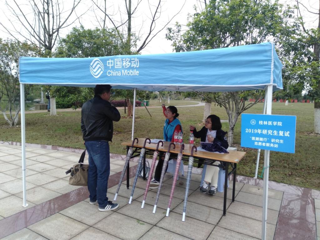 为给考生们提供方便快捷、贴心周到的服务,校研究生会和“医路随行”研究生志愿者协会积极筹划,精心组织,在校道和教学楼等地设置“服务点”,配置 “爱心雨伞”,为家长和考生应对桂林多雨变幻的天气提供服务,充分展现了研究生积极向上的精神风貌。