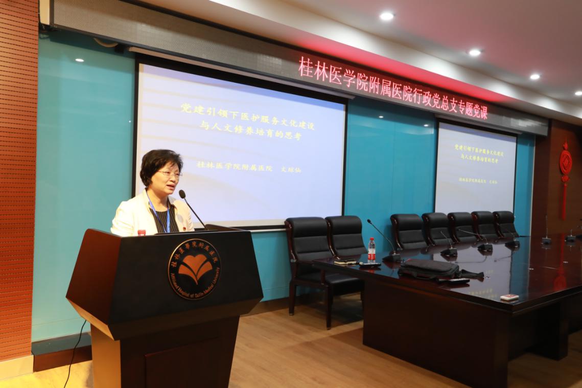 为深入推进“不忘初心、牢记使命”主题教育开展,11月8日下午,附属医院(临床医学院)党委书记文琼仙在综合楼会议室为医院行政党总支110名党员上题为《党建引领下的医院文化建设与人文修养培育》专题党课。