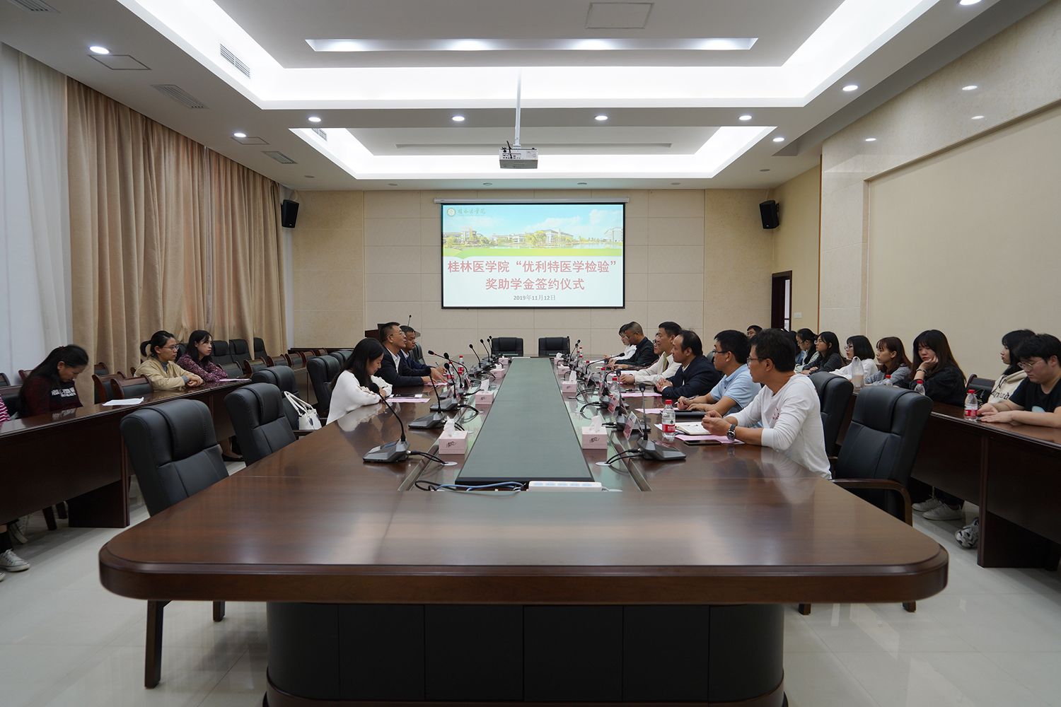 11月12日下午,beat365官网在临桂校区明德楼五楼会议室举行“优利特医学检验”奖助学金设立签约仪式。学校党委副书记齐俊斌、学生工作部、党办院办、第二附属医院、生物技术学院、医学检验学院负责人,学生资助管理中心老师以及各二级学院师生代表,桂林优利特电子集团有限公司执行总裁郑泽辉、国内销售总监周健春、人力资源部经理王艳参加了签约仪式。仪式由学生工学部部长胡友根主持。