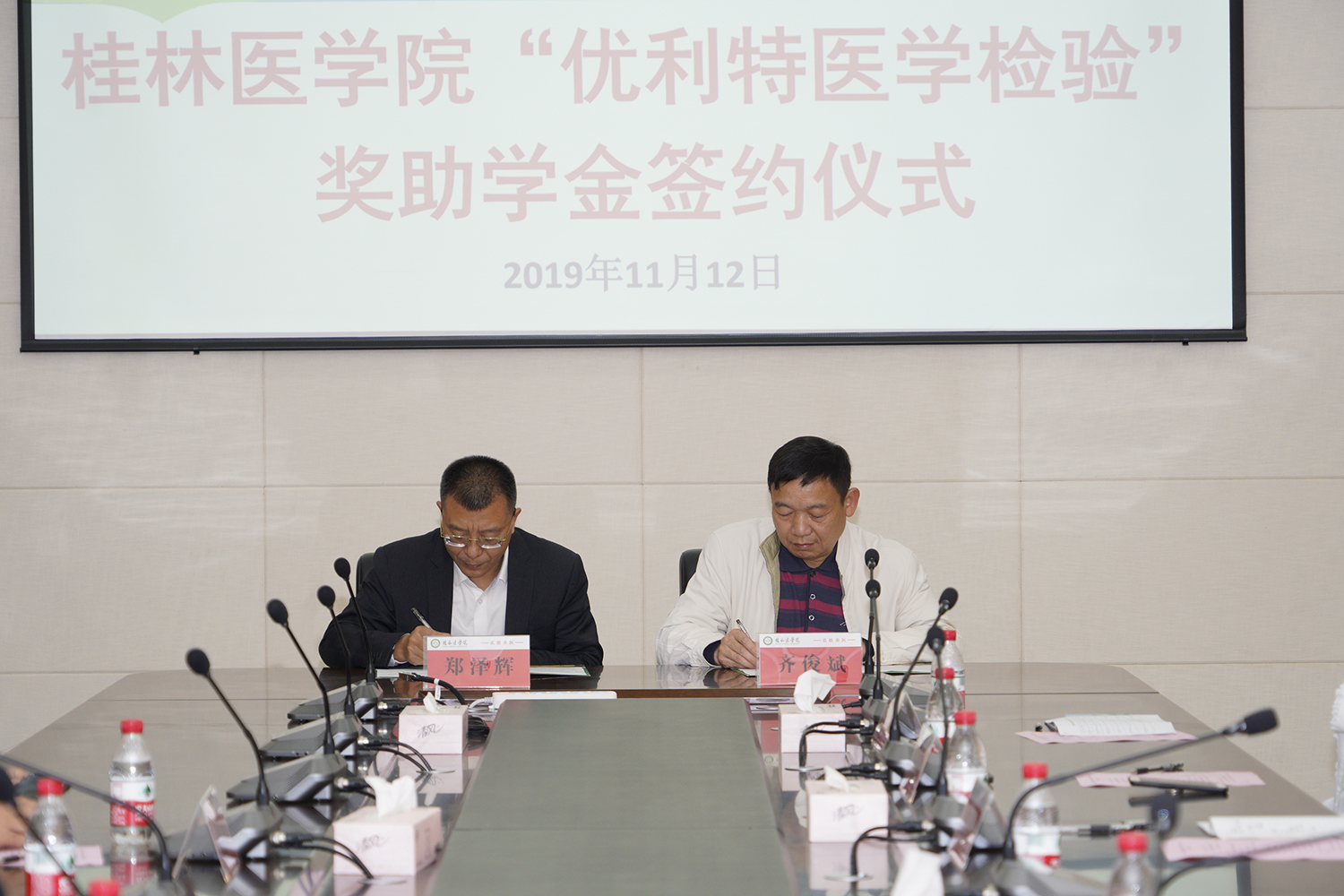 齐俊斌致欢迎词,感谢桂林优利特电子集团有限公司长期以来对beat365官网学生的深切关怀和热忱帮助,表示学校一直高度重视和全力做好“优利特医学检验”奖学金和助学金的评比、发放,以及学生的感恩教育工作。优利特集团执行总裁郑泽辉介绍了近年来集团的发展和取得的成绩,表示公司在学校继续设立“优利特医学检验”奖助学金,是为了回馈社会,感恩学校为公司输送了大批的优秀人才,同时也为学生的实习、就业和成长成才提供平台。双方还就科研交流、校企合作、学生科技创新等方面进行了沟通和交流。随后,双方签订了“优利特医学检验”奖学金与助学金设立协议。