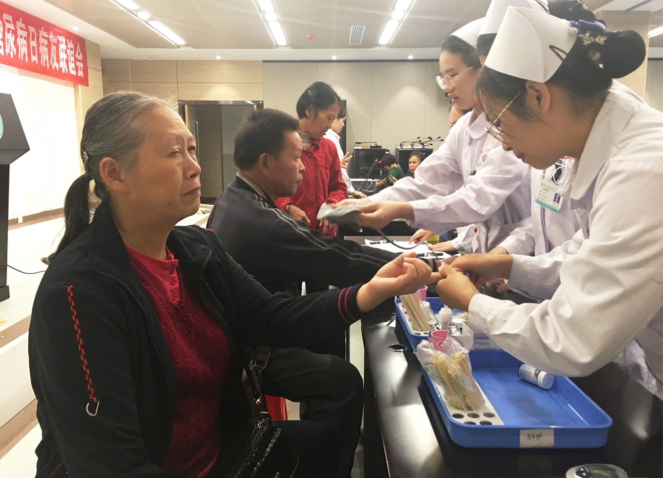 活动现场,医护人员首先为在座的患者及家属进行了免费的血糖、血压监测。随后,专科护士曾令碧对糖尿病足的预防及护理做了详细的讲解,图文并茂,通俗易懂;紧接着由护士们带领现场患者一起学习了经络运动操。现场患者热情高涨,纷纷表示这套经络运动操的实用性强,且方便易学。接下来的有奖知识问答环节更是加深了患者对糖尿病知识的了解和掌握。最后,医护人员就患者提出的问题一一解答,并发放了有关糖尿病相关知识的健康教育手册及相关礼品。整个活动有条不紊,受到患者一致好评。