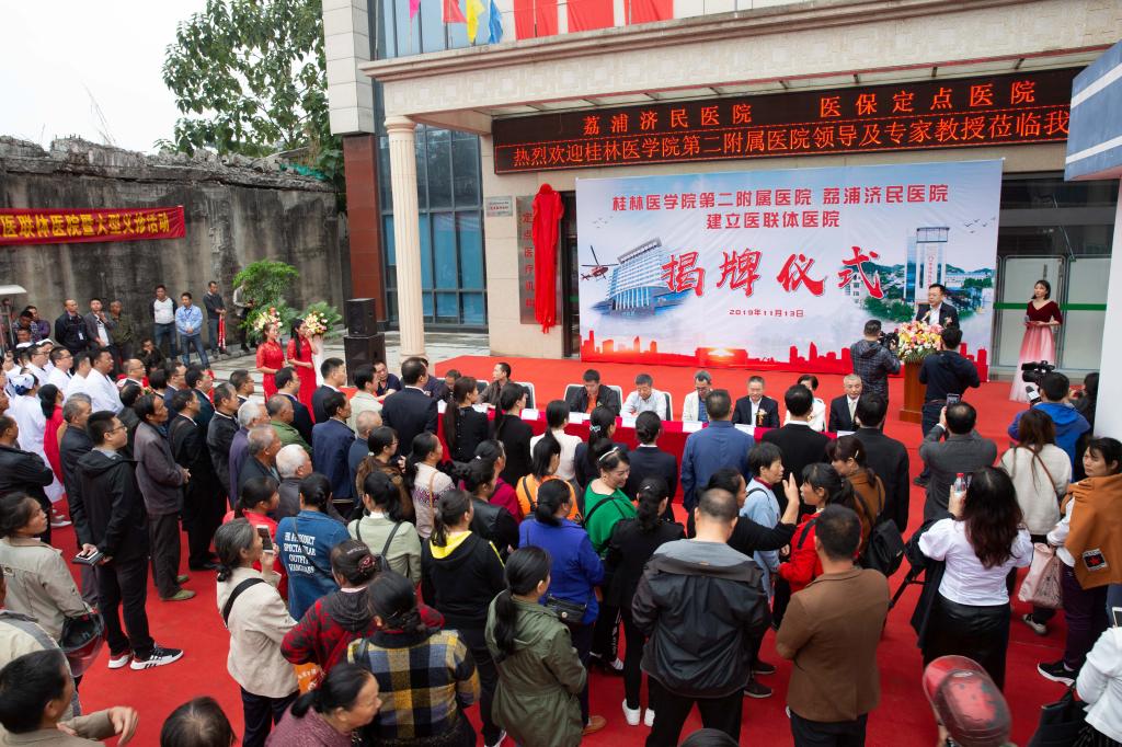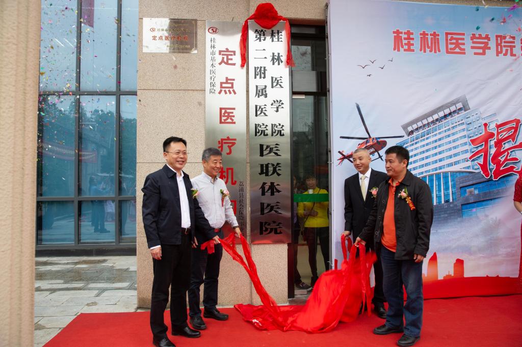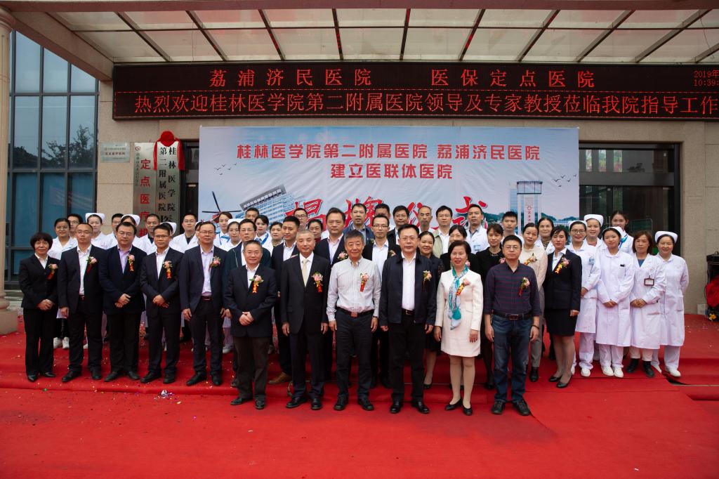 beat365唯一官网第二附属医院党委书记宋剑非,党委副书记、院长葛波,党委副书记、纪委书记王群,党委委员、副院长郑楚,副院长袁晟光以及荔浦济民医院董事长蒋仁壬带领双方医院医护人员代表参加揭牌仪式。荔浦市卫生健康局局长古技出席本次活动并致辞。