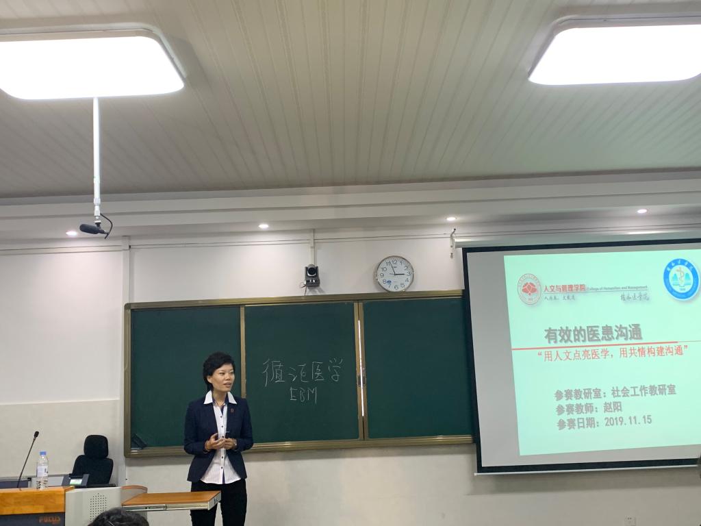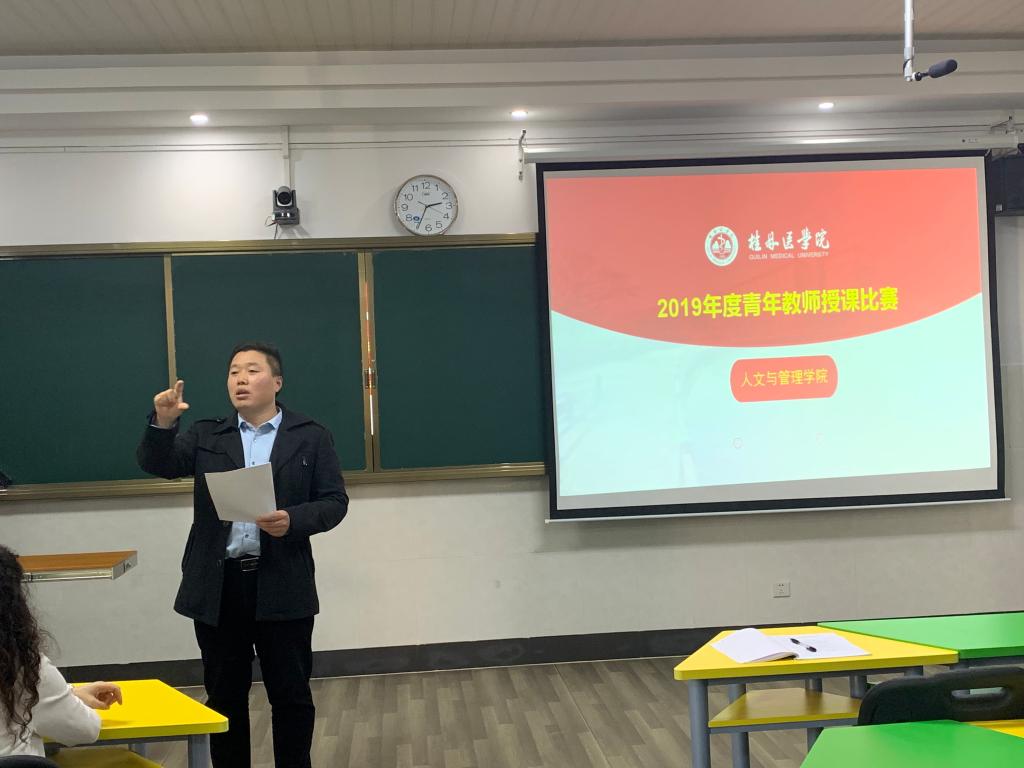 来自人文医学教研室、社会工作教研室、公共管理教研室、卫生经济与社会保障教研室的4名教师在经过教研室内部的比赛后脱颖而出,参加本次学院级初赛。参赛教师分别以“医患沟通-问诊”、“有效的医患沟通”、“医疗服务管理”、“法律基础”为主题进行授课;以大方的教态、幽默风趣的语言、清晰的授课思路、精致的课件、丰富的案例、结合现场提问等互动环节展示出各具特色的授课风采,在传授专业知识过程中巧妙的引入人文教育,并体现了立德树人。