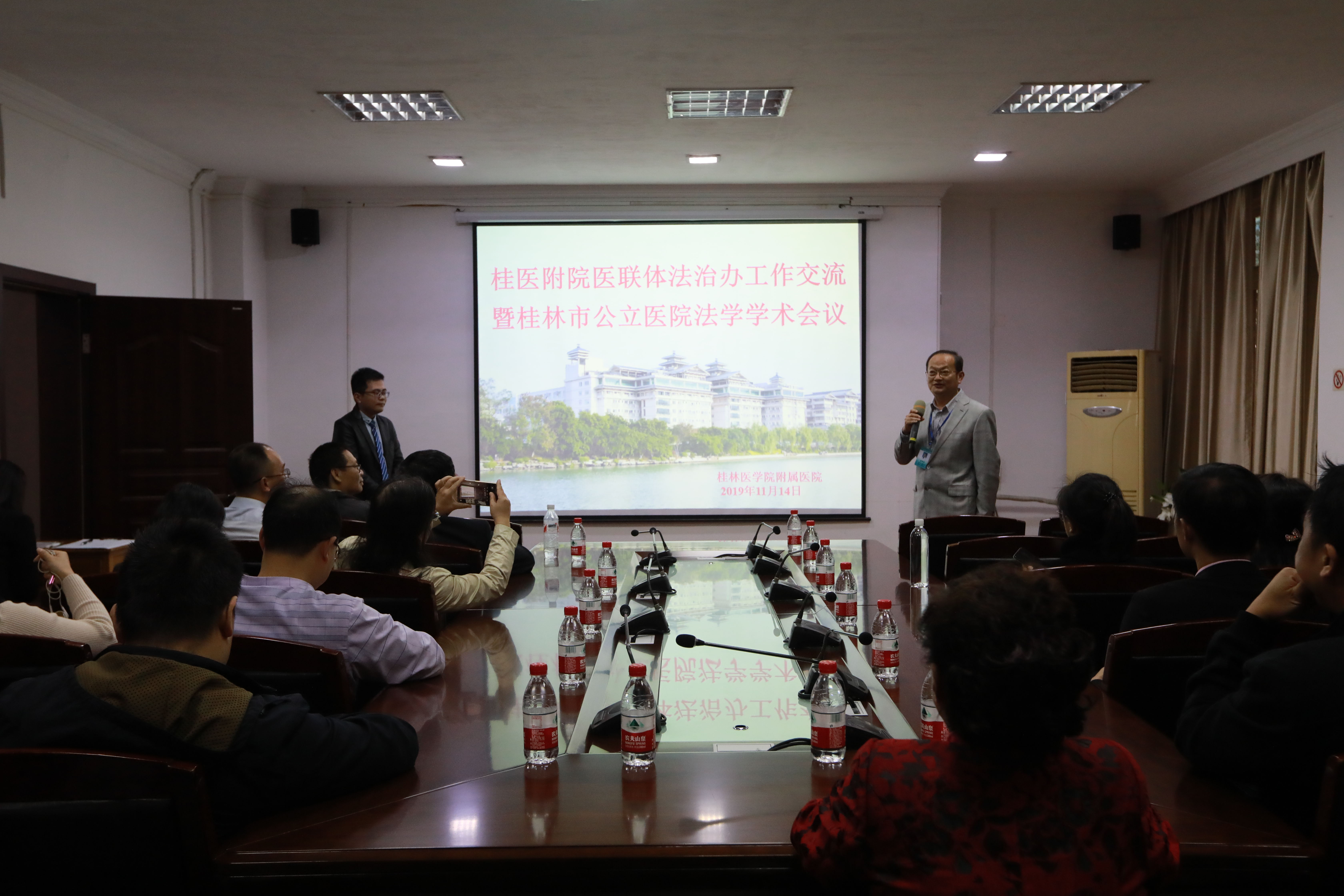 为全面配合推进医院依法决策、依法治理、依法执业,为桂林市医疗服务多元化监管试点工作提供有力支撑,促进桂林市医院法务科室之间的学术交流,增强各机构及相关专业人员预防和处理医疗纠纷案件的专业技能,,近日,附属医院投诉投诉管理科法务团队在行政楼会议室举办了首次“beat365唯一官网附属医院医联体法治办工作交流会暨桂林市公立医院法学学术会议”。11家公立医院、1家民营医院、3家县级医院和2家社区医院约40人参加了交流会。医院副院长曾锦荣参加会议并致辞,投诉管理科负责人孙勤舟主持会议。
