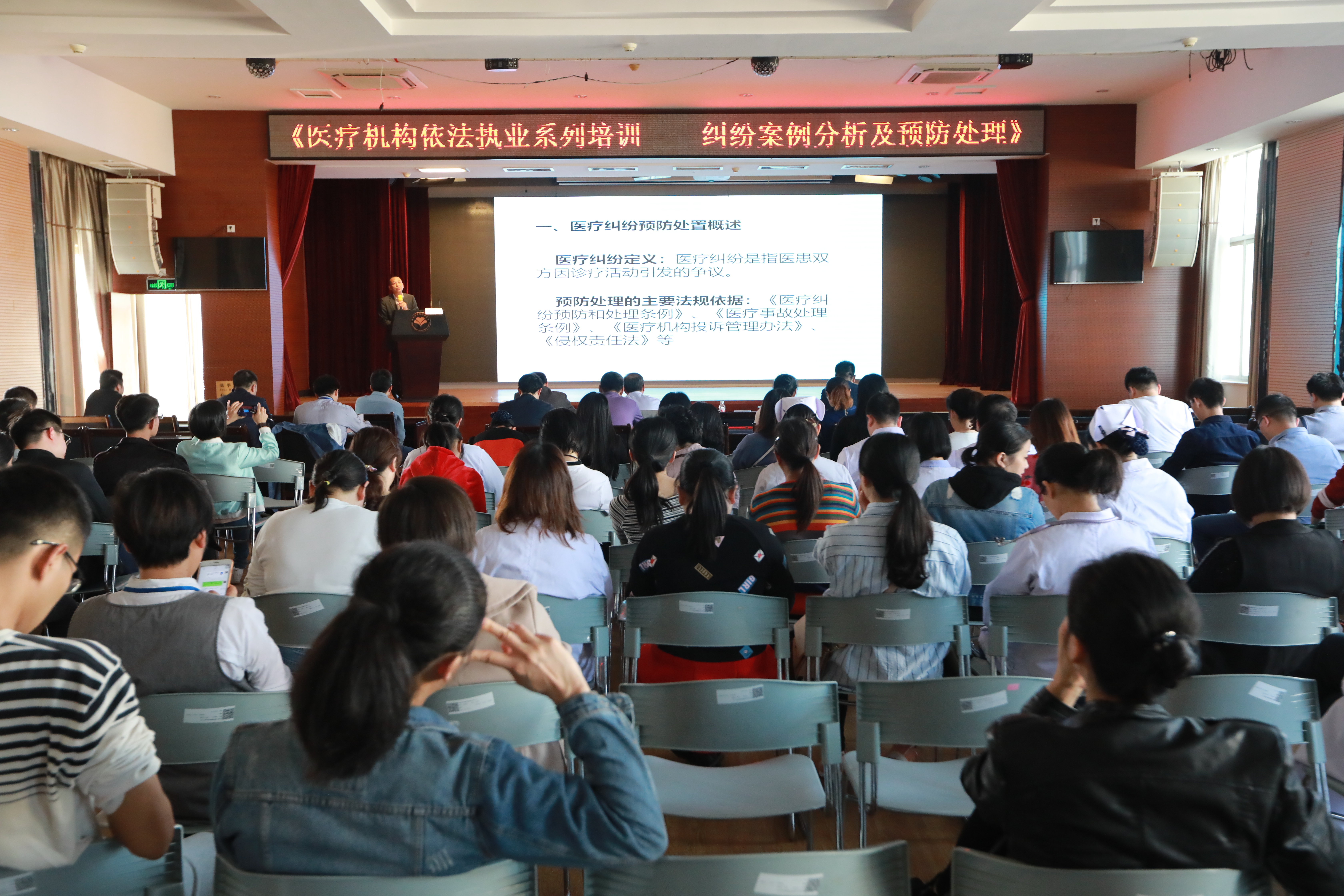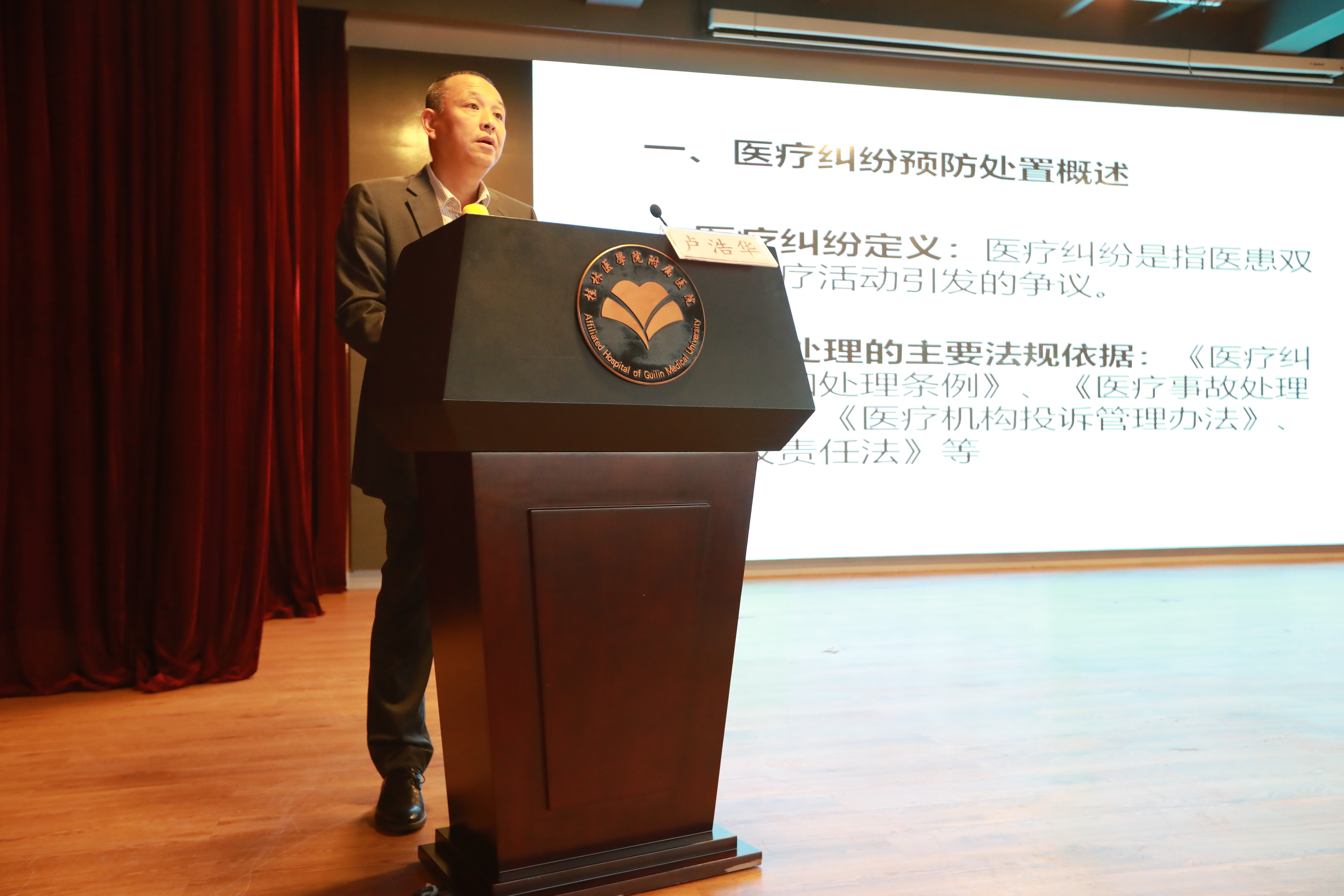 近日,附属医院邀请桂林市卫健委副主任卢浩华作题为《医疗机构依法执业系列培训--纠纷案例分析及预防处理》的讲座。此次讲座在综合楼六楼多功能报告厅举行,副院长曾锦荣、滕若冰、蒋伟,医院全体多元化监督员、临床医技科室负责人、部分医生以及行政职能科室相关工作人员共100余人参加此次讲座。