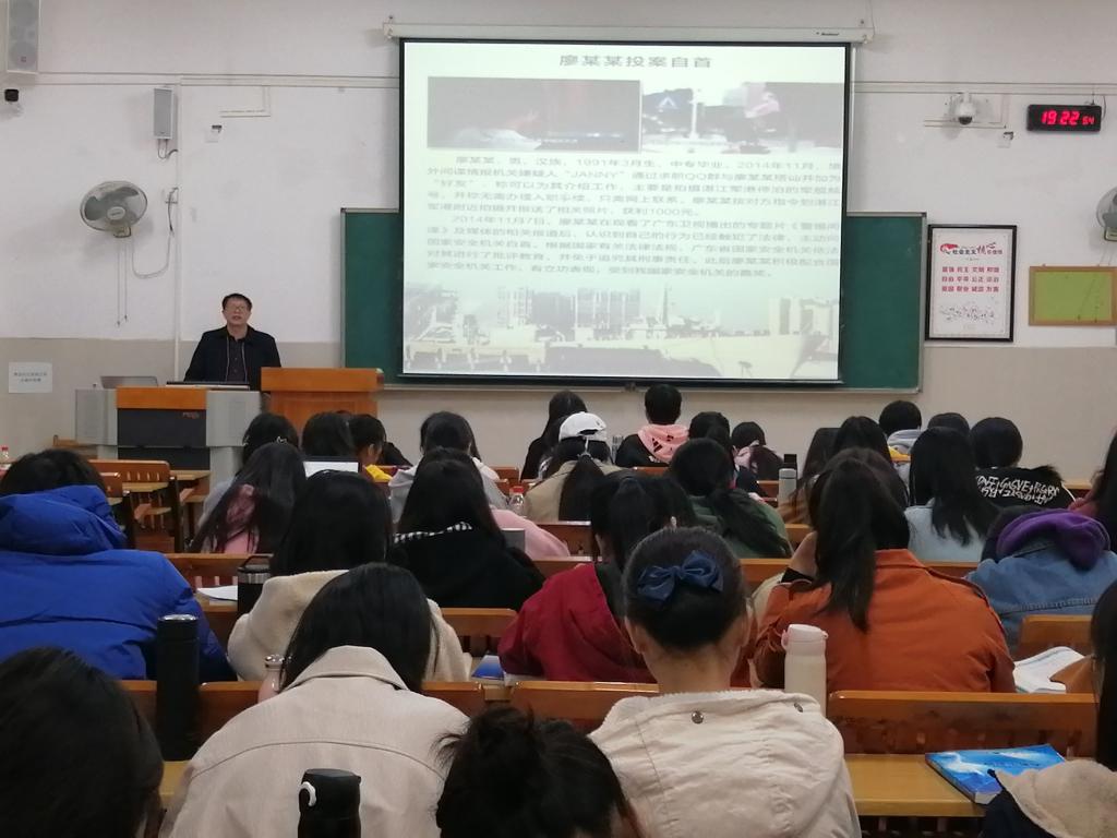 会议伊始,主持人欧阳伟给同学们国家安全普法宣传教育片之《反间谍法》动画片。随后,辅导员唐老师向同学们讲解了国家安全的含义、国家相继出台的一系列法律法规、开展“反奸防谍”国家安全的背景和意义,用实例列举了危害国家安全行为及相关罪名。最后,他强调了作为新时代大学生如何以实际行动维护国家安全。