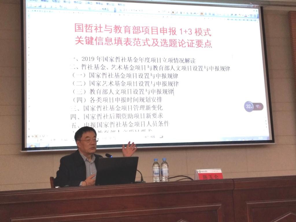 陈玉仑教授从2019年国家社科基金项目立项情况解读、国家社科基金项目管理新变化、新要求、国家社科基金项目“盲评”与“会评”实施过程与评审关注点、国家社科基金项目《申请书》与《活页》填表范式、国家社科基金如何选题、国家社科基金项目如何论证、科研常用词汇、十九大报告写作技巧与精彩用语在项目论证中的应用、《国家社科基金项目资金管理办法》解读、“回执”填写规范、注意事项和强调事项等20个内容进行了详细的讲解,并结合实例深入浅出进行分析国家社科基金申报书和活页的规范撰写。