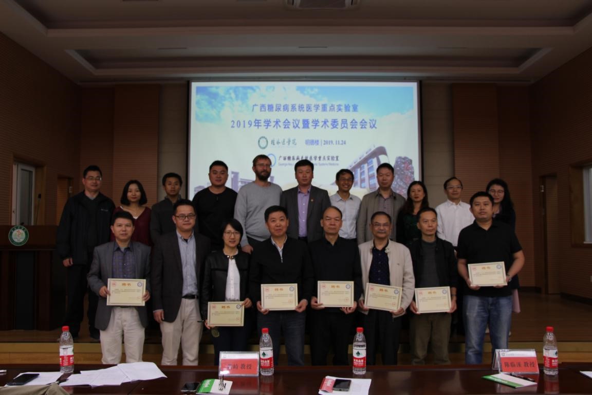 会议前,专家们还在广西糖尿病系统医学重点实验室召开了学术委员会会议,尹凯教授介绍了实验室基本情况,各位专家对实验室的发展方向、研究特色凝练等提出了诸多建设性意见,会议还选举产生了以北京大学唐朝枢教授为主任委员的新一届学术委员会,科技处副处长于鸿浩教授为到会委员授予聘书。研究生院简洁院长、基础医学院陈健院长、附属医院金俊飞副院长及学校相关师生也到会指导,并与到会专家和实验室主要成员合影留念。