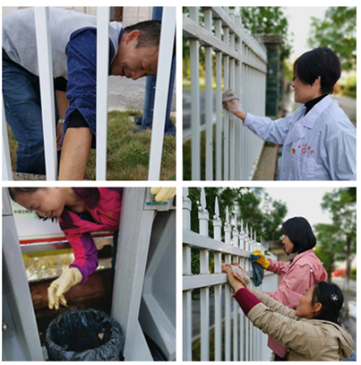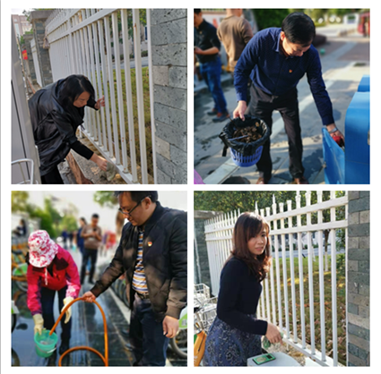 党支部志愿者们,手拿着抹布、水桶、脸盆、刷子等洗刷工具,从校园内扯来了自来水管,对学校东大门两侧的隔离栅栏和垃圾进行了清洗保洁活动。党员们不怕脏、不怕累,认认真真地对栅栏、广告栏、自行车和垃圾进行洗刷清理。引来了停在学校大门右侧的三轮车师傅和过往群众的不住“点赞”。