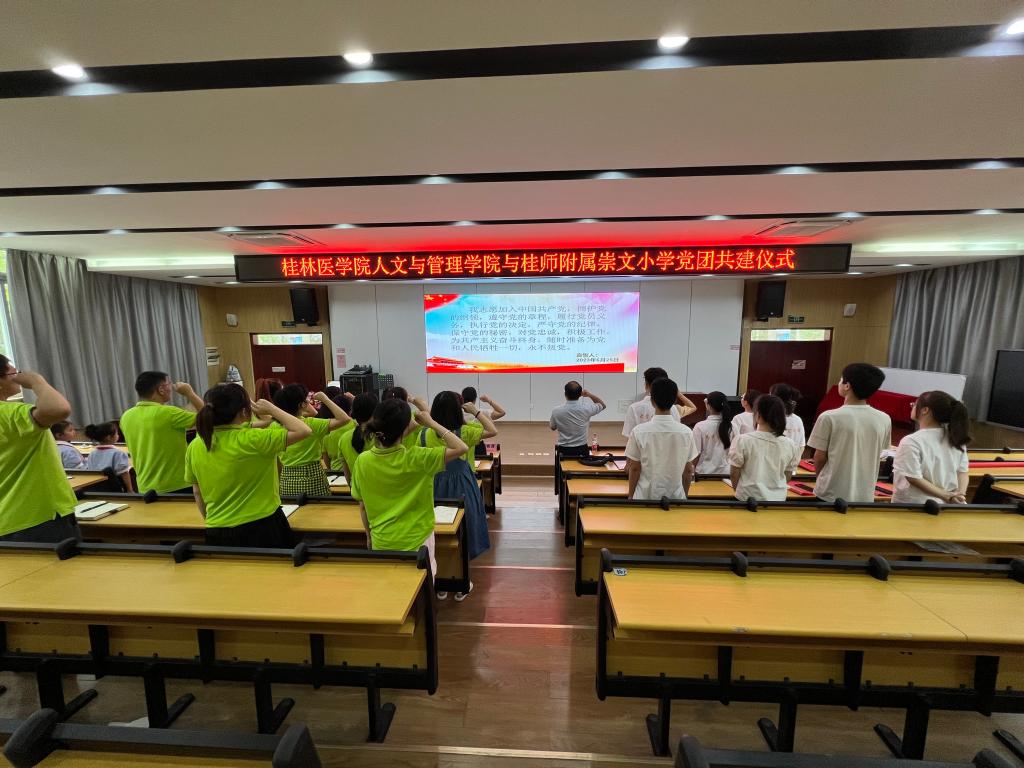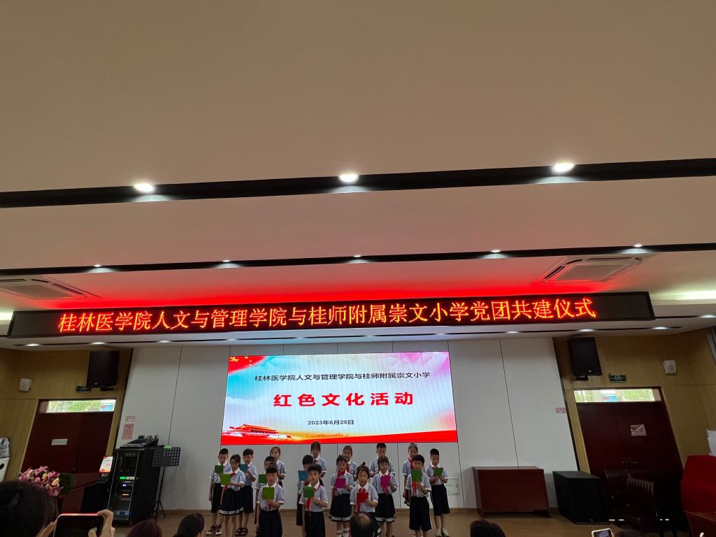 6月25日下午,人文与管理学院与桂林师范高等专科附属崇文小学举行党团共建合作签约及揭牌仪式。人文与管理学院党委书记庞伟毅,党委副书记、纪委书记周小群及团委老师,桂师附属崇文小学校长周菁菁、副校长邓朝英及全体党员出席此次活动。