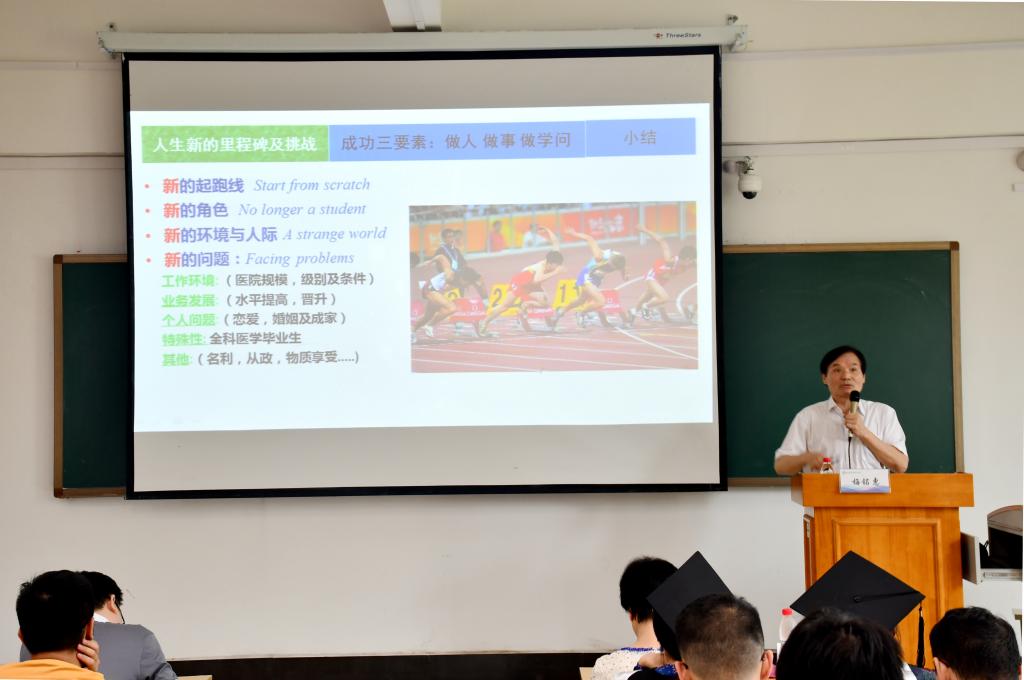 梅铭惠先从毕业生在今后人生新的里程碑及挑战出发,毕业生即将面临着新的起跑线、新的角色、新的环境与人际、新的问题等等,必须要学会抓住主要矛盾,炼铸坚韧不拔的意志,培养独立自主的能力,才能在未来充满挑战的道路上不断前行。梅铭惠向毕业生分享了个人求学之路及工作经历,强调做人要敬畏生命、实事求是、学会换位思考,目标明确,做事认真,能吃苦才能成事,要会做、会讲、会写才具备做学问的基本要素,做学问更需要为之不厌,孜孜不倦。最后,梅铭惠通过裘法祖教授的名言“做人要知足,做事要知不足,做学问要不知足”勉励同学们,希望同学们能够知不足而奋进,望远山而前行。