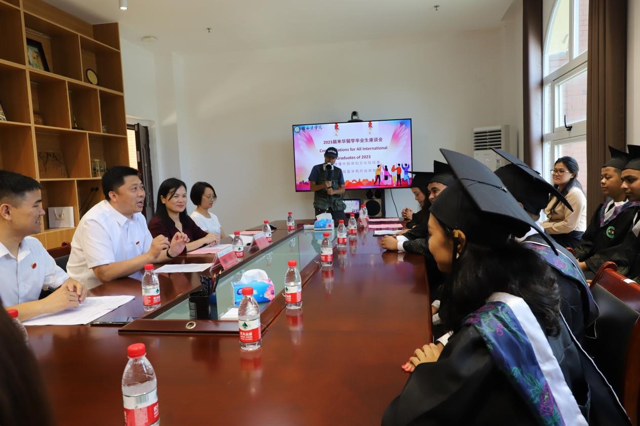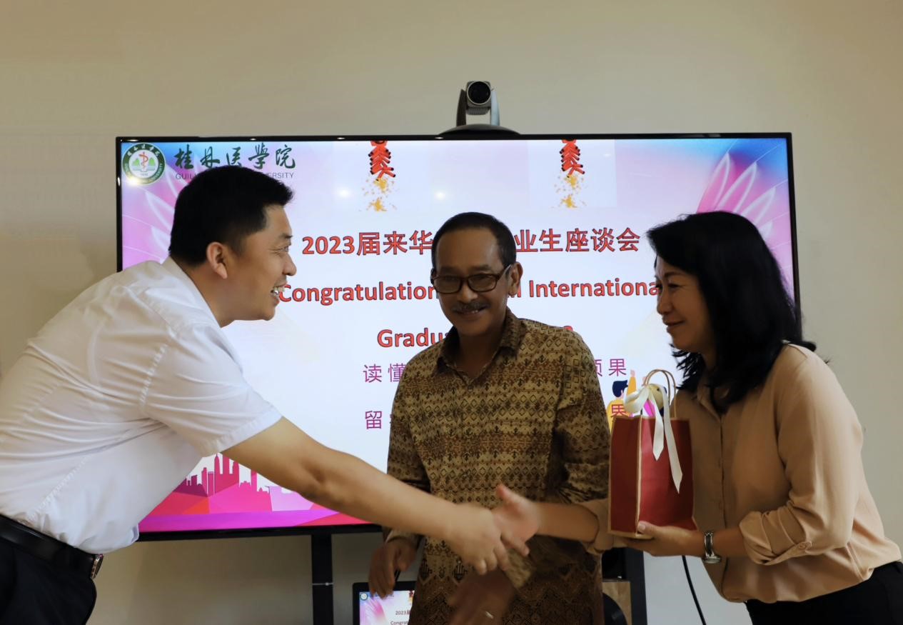 读懂中国,感知文化结硕果;留学桂医,学有所成奔世界。在这个绚烂的夏天,beat365官网2023届来华留学生迎来了他们的毕业时刻。6月27日上午,国际教育学院在国际教育交流中心S102会议室召开beat365唯一官网2023届来华留学毕业生座谈会。留学生、校友代表、家长代表、国际教育学院领导班子及有关工作人员参加会议,会议由国际教育学院副院长覃涛主持。