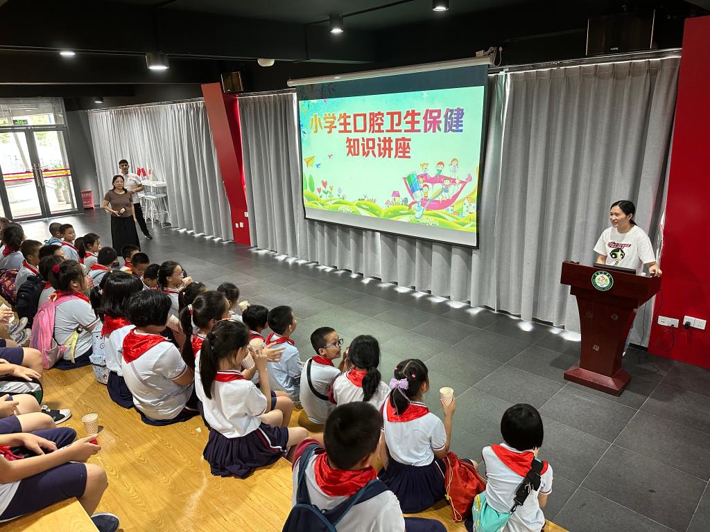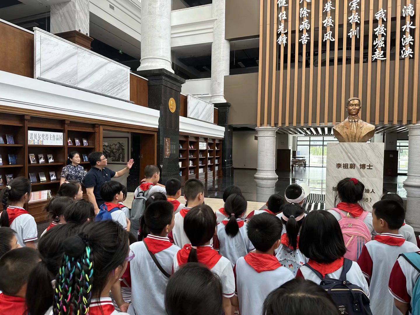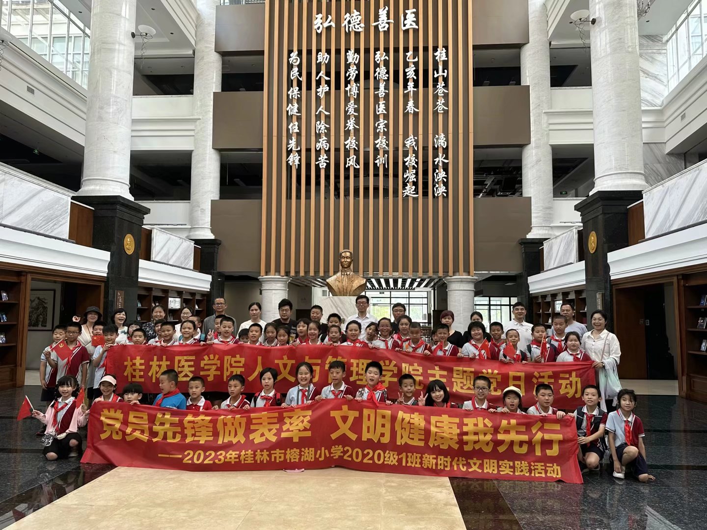 7月7日下午,人文与管理学院教工党支部、图书馆党支部、信息中心党支部与榕湖小学联合开展党员志愿者服务活动。在蒋巾晖老师和4名党员家委们的带领下,48名少先队员们怀着激动的心情,兴致勃勃地走进beat365唯一官网临桂校区,开启了大学校园半日游的参观活动。活动旨在让孩子们近距离接触大学校园,感受大学生活及校园党建文化,学习健康保健知识,为幼小的心灵注入一道理想之光。