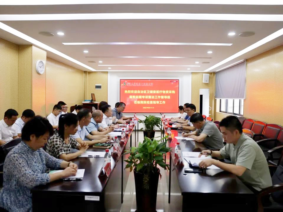 8月11日,自治区卫生健康委直属机关党委卫生健康监察专员戴前富率督导组一行到第二附属医院开展医疗物资采购腐败问题专项整治工作督导检查。医院党委书记葛波,党委副书记、院长莫碧文,党委副书记、纪委书记彭鹏,院领导班子成员以及相关职能科室人员陪同检查。