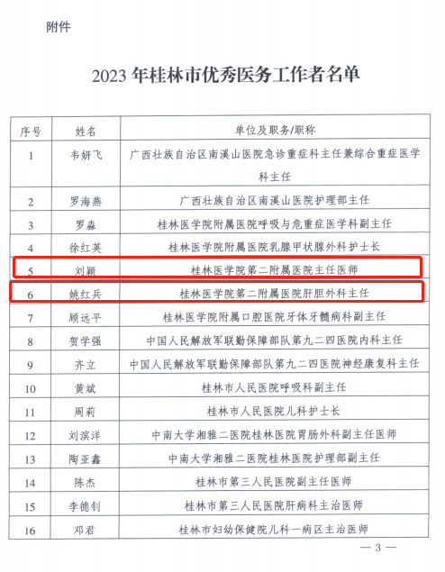 为进一步弘扬医护工作者敬佑生命、救死扶伤、甘于奉献、大爱无疆的卫生健康崇高精神,树立典型,弘扬正气,激励广大医务工作者以崇高的职业道德、精湛的医疗技术积极投身卫生健康事业,桂林市卫生健康委员会决定对近年来工作表现突出的同志授予优秀医务工作者荣誉称号,第二附属医院刘颖教授、姚红兵教授位列其中,获此殊荣。