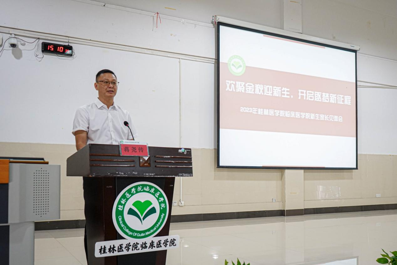 蒋尧传代表临床医学院全体师生员工对同学们和家长们的到来表示热烈的欢迎,祝贺同学们考上心仪的大学并对教导学生成长的家长们表示诚挚敬意。他向新生及新生家长介绍了2023级辅导员、班主任、班级导师。
