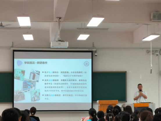 活动伊始,李云秋以“树立远大梦想,绽放青春光彩”为主题展开入学教育,详细介绍了学校和学院的发展历程,对同学们提出“树立远大理想,明确发展目标,尽快适应环境,遵守校规校纪,强化专业学习,提高综合素质”六点要求,希望同学们做有理想、敢担当、能吃苦、肯奋斗的新时代好青年。刘洪波对医学检验学院的现状以及教学改革、校企协同育人、人才培养等方面作了详细介绍,同时对同学们提出了期望,他希望同学们牢记“弘德善医”的校训,肩负起健康中国建设的使命担当,早日成为一名合格的医者。黄晨结合党的二十大精神,以“学习党史 端正入党动机”为题开展入党启蒙教育,并号召新生加强理想信念,积极向党组织靠拢,与祖国在新时代共同成长。尹铁球围绕培养方案和培养过程管理进行了详细宣讲。