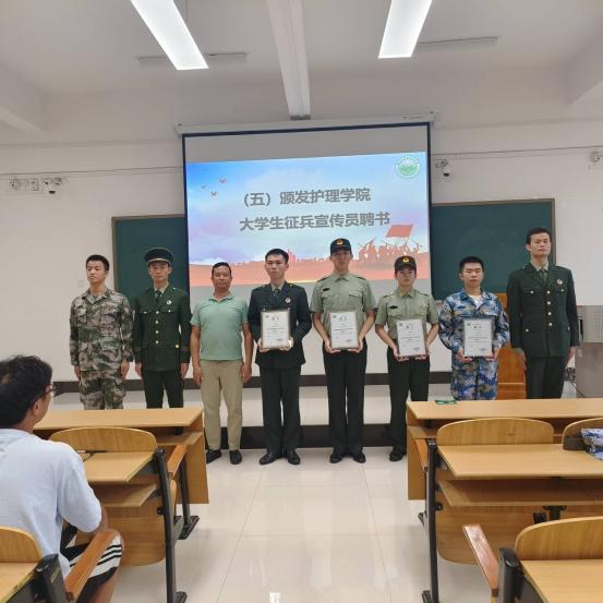 活动最后,护理学院学工办主任为大学生征兵宣传队新聘队员颁发了聘书,感谢退役复学同学对学院征兵工作的支持,同时鼓励2023级新同学在接下来的大学生活里,以退伍学长学姐为榜样,认真学习本领,强健体魄,牢牢把握青春时光,勇追青春梦想,在祖国需要的时刻,在大学毕业之际,实现从军报国理想。