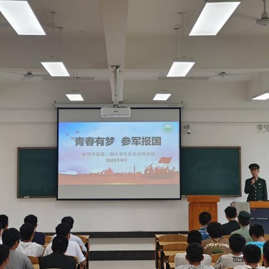 为响应国家号召,唤起大学生参军报国热情,把爱国之心化为报国之行,把芳华青春融入钢铁长城,9月12日,护理学院面向2023级全体男生,在临桂校区举办“青春有梦,参军报国”2023秋季学期第一期征兵宣传教育活动。