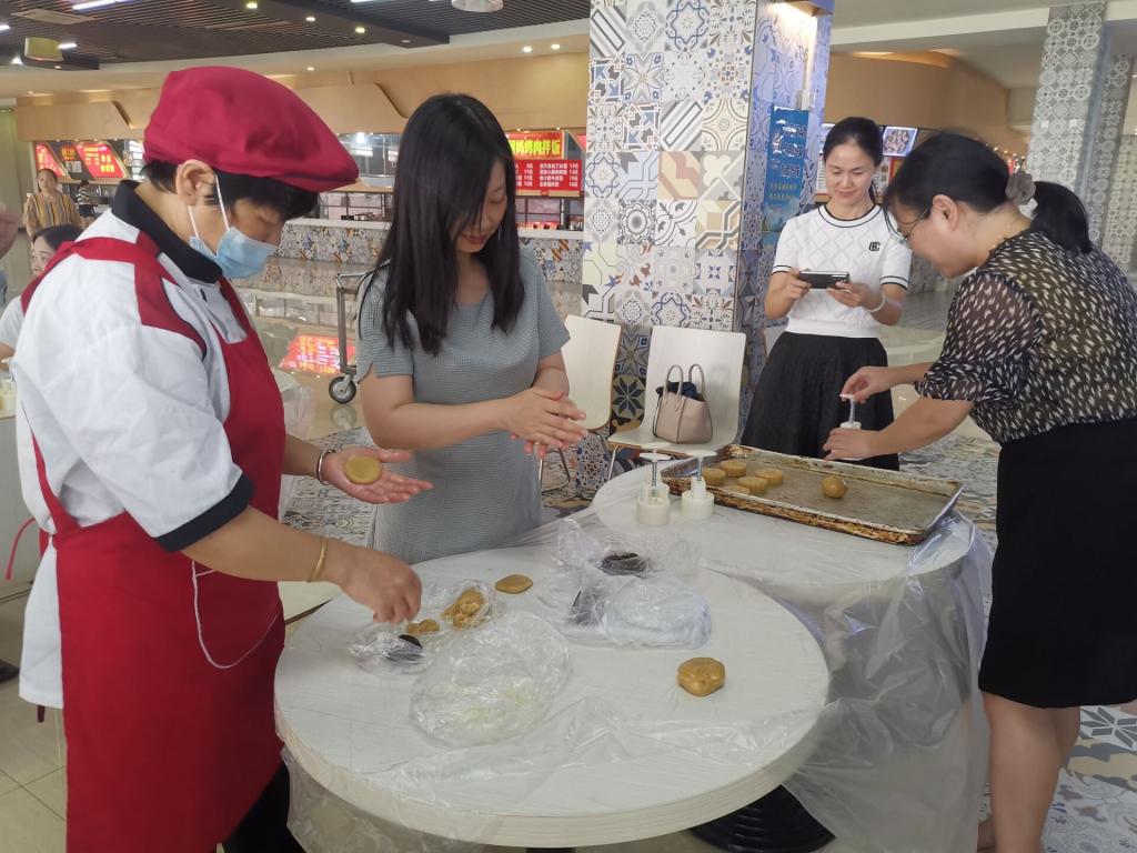 活动分两个环节:手工制作月饼和茶艺知识讲座。活动现场,桌面上摆放了提前准备好的饼皮、馅料、月饼磨具等所需的材料,面点师傅为参加活动的老师们讲解制作月饼的方法及注意事项,在师傅的指导下,大家一起揉皮、包馅料、放入磨具压成月饼。经过一个多小时的制作,烤盘上摆满了各种图案的月饼,简单而有趣的制作流程让大家乐在其中。