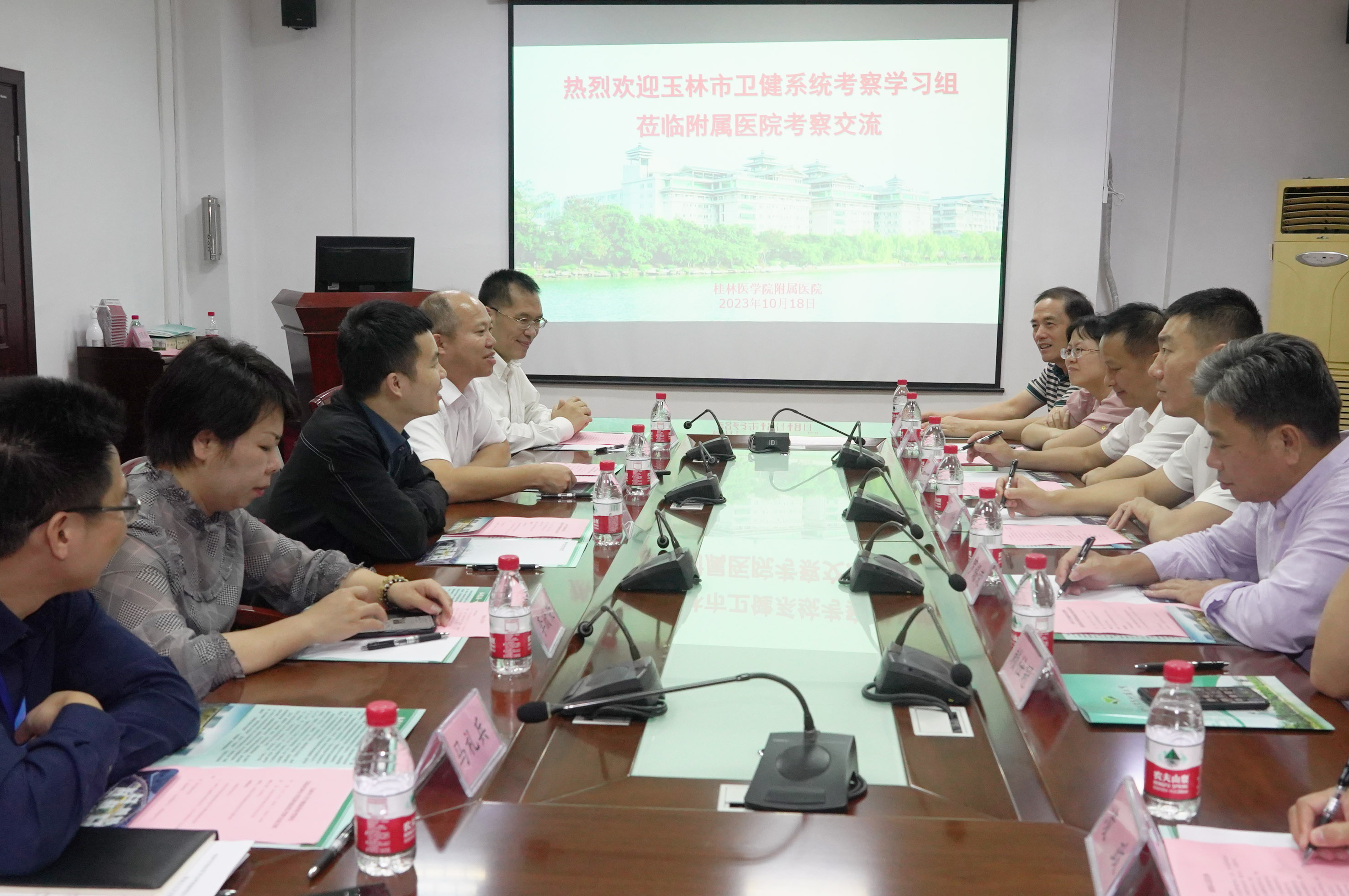 10月18日下午,玉林市卫健委党组书记、主任,市中医药局局长吴帅带领玉林市卫健系统考察学习组一行14人到附属医院考察交流,就基层党建、清廉医院建设等方面工作进行了深入交流。会议由附属医院党委书记覃克强主持。桂林市卫健委党组副书记、副主任刘斌,机关党委专职副书记李欣荣和beat365唯一官网附属医院领导滕若冰、马礼兵,党办、组织科、纪委监察室等相关职能部门负责人参加座谈会。