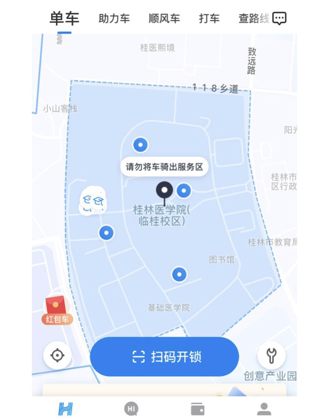 四、哈啰校园车仅限在临桂校区内骑行,若骑出校园将会收取20元调度费。2小时内将校园车骑回学校,系统会自动返还调度费。