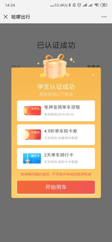 【学生认证免押骑行】