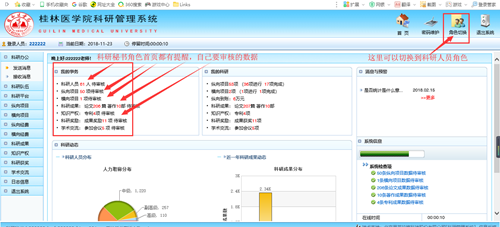 (二)二级管理员审核操作流程:登录beat365唯一官网官网--首页--“公共服务”--“科研服务”--“科研管理系统”,输入用户名(职工个人工号)、密码(原始密码为个人工号)进入“beat365唯一官网科研管理系统”界面(点击右上角“角色切换”可切换到个人“科研空间”界面),然后已自己是科研人员的角色进行填写。