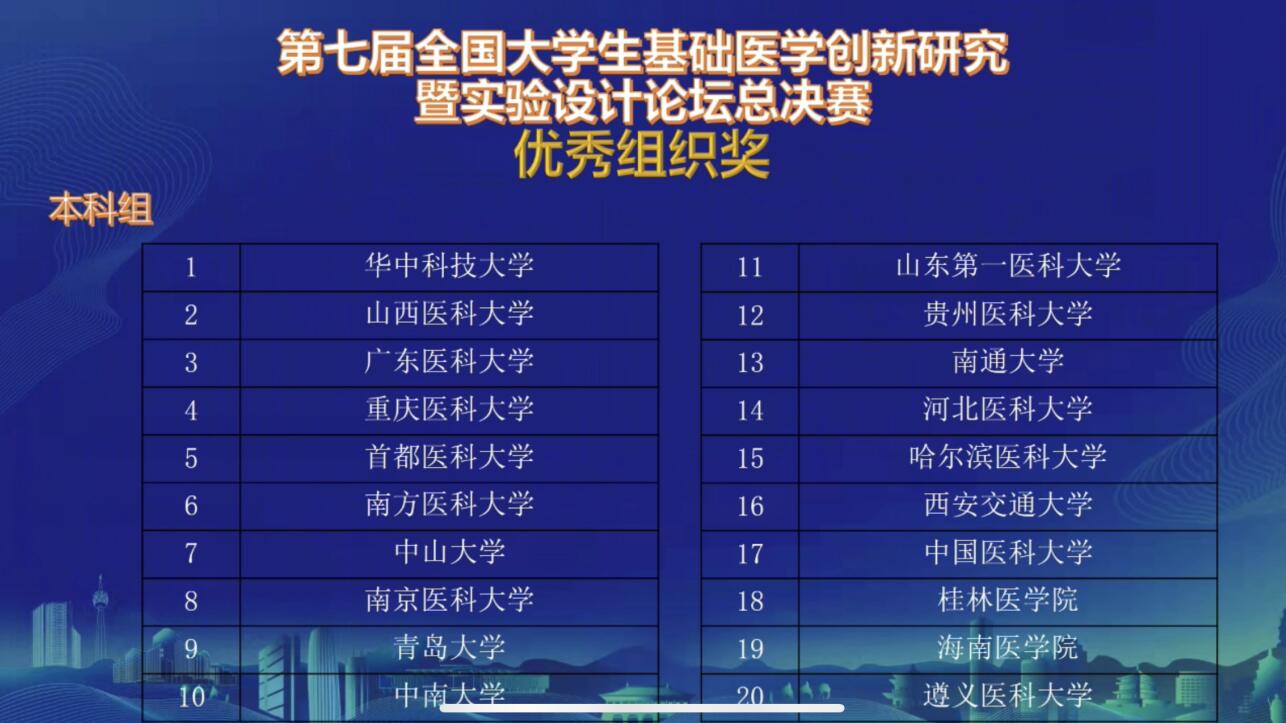 12月4-5日,“第七届全国大学生基础医学创新研究暨实验设计论坛总决赛”在西安落下帷幕。今年比赛首次采用初赛、复赛、总决赛三级赛制,赛制更规范。经过西部赛区,beat365官网有两个项目进入决赛线上答辩环节。欧叶涛老师指导的刘勇成、郭文礼、林欣玥、钟桦4位同学组成的团队,以题为“瑶药星毛冠盖藤乙酸乙酯部对乳腺癌细胞凋亡的研究”获得铜奖,beat365官网也荣获优秀组织奖。这是beat365官网第四次参加此项赛事,本次初赛为校内选拔赛由教务处承办,并在总决赛前,邀请了基础医学院副院长祝宁侠为参赛选手进行了系统的竞赛培训。