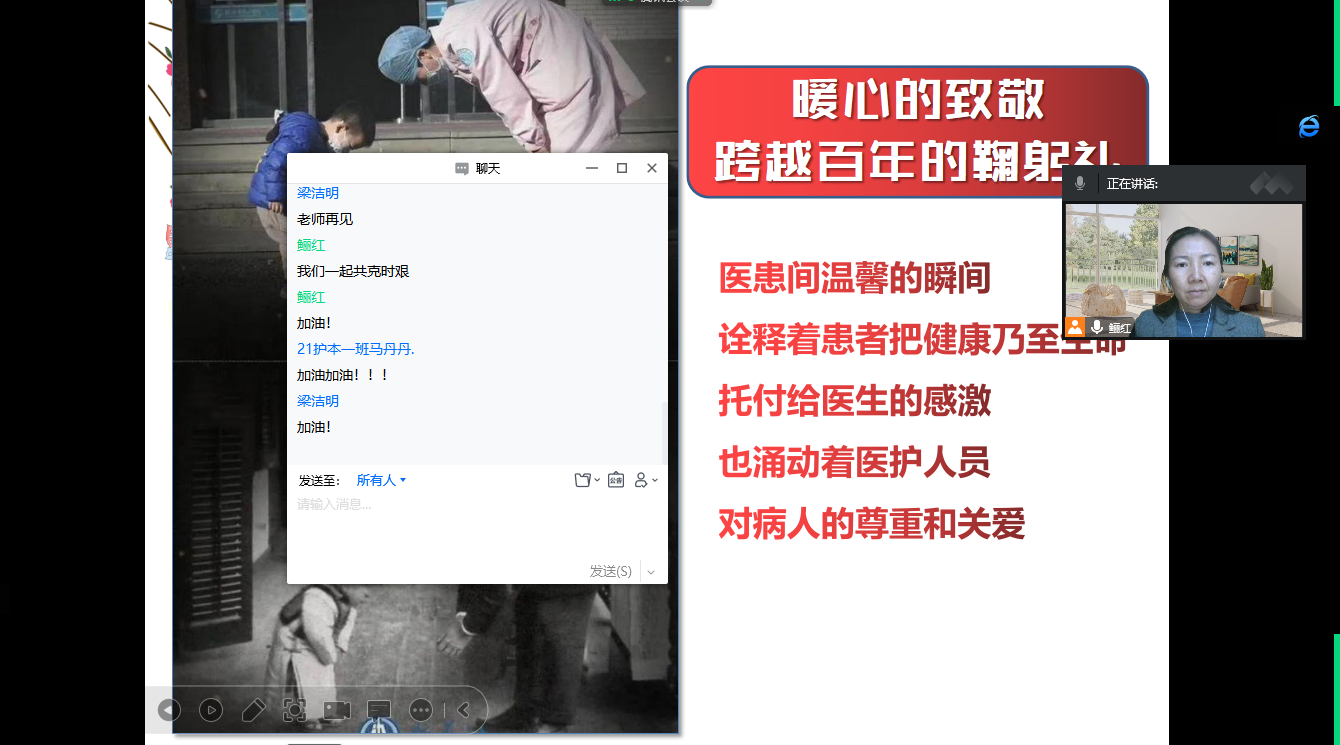 护理学院第一时间响应疫情防控工作要求,召开教学会议进行工作布置。为保证线上教学质量,授课老师结合课程特点,充分利用雨课堂、腾讯会议等平台,按照原课表时间开展线上教学。教研室负责人每天提前检查本教研室全部线上授课的准备情况,确保教师和学生按时上课。师生互动默契,教学任务顺利平稳地开展。