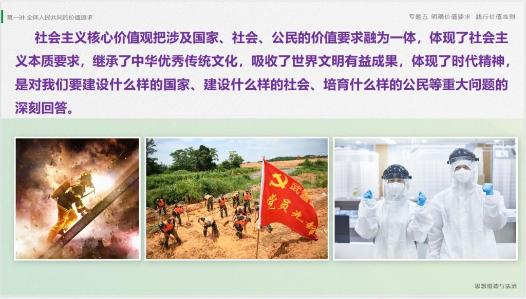 马克思主义学院《思想道德与法治》课程,在第四章第一节《全体人民共同的价值追求》“社会主义核心价值观”的教学内容中,结合党的二十大报告,对核心价值观24个字的内容进行讲解。同时引用抗疫等案例,结合“中国精神”与“中国力量”展开讲解,引入王继才夫妇、陈延年和陈乔年的感人故事,让学生在疫情特殊时期感同身受,更深刻了解社会主义核心价值观的重要意义和科学内涵。