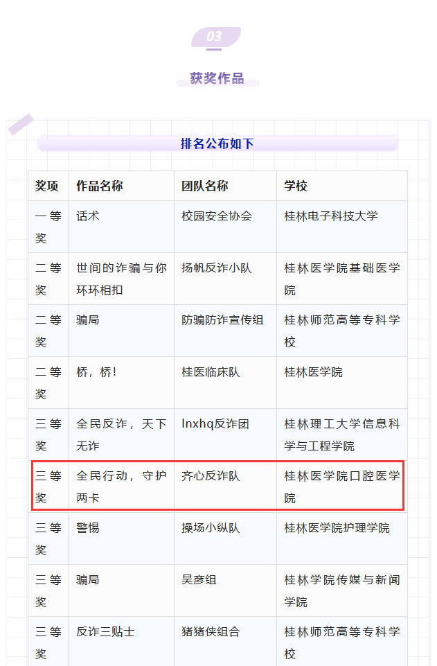 近日,由桂林市公安局、团市委、人民银行桂林市中心支行、桂林银保监分局联合主办,桂林银行承办的“桂林市高校防范电信网络诈骗创意视频大赛”获奖名单公布,口腔医学院报送的作品获得此次大赛三等奖。
