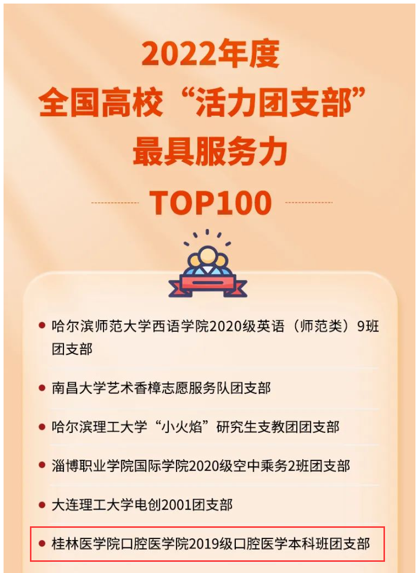 据了解,2022年度全国高校“活力团支部”风采展示活动共分为“引领力”“组织力”“服务力”“贡献度”“改革味”“好作风”六个模块,对经各省遴选进入全国展示的600个团支部进行风采展示,3月15日至30日,该活动完成全国展示阶段。经校内初赛、省级审核和全国展示等环节,beat365唯一官网口腔医学院2019级口腔医学本科班团支部以28112票从该模块100个团支部中脱颖而出,荣登全国“服务力”榜单TOP10,成为广西高校唯一入选该模块前列的基层团组织。
