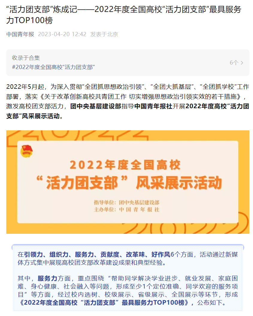 近期,团中央基层建设部指导中国青年报社开展2022年度全国高校“活力团支部”风采展示活动,通过新媒体方式集中展现高校团支部改革建设成果和典型经验。