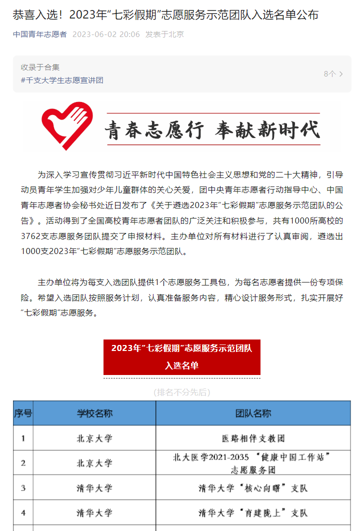 据了解,本次活动旨在深入学习宣传贯彻习近平新时代中国特色社会主义思想和党的二十大精神,引导动员青年学生加强对少年儿童群体的关心关爱,从全国1000所高校的3762支青年志愿者团队遴选出1000支2023年“七彩假期”志愿服务示范团队。